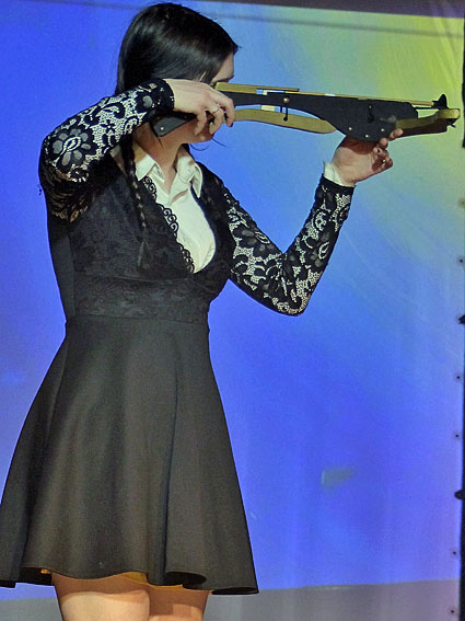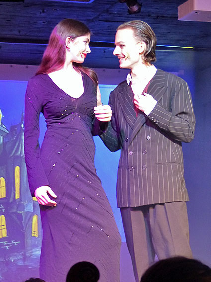 „Artur Saake schmeißt sich als Familienoberhaupt Gomez vor allem gesanglich ins Zeug und schmettert kraftvoll seine Soli in die Aula. Für den 18-Jährigen liegt der Reiz in der Zerrissenheit der Rolle des Grusel-Vaters.Er muss seiner Frau Morticia gerecht werden, die Mafalda Rauhut wunderbar divenhaft gibt, und gleichzeitig Töchterchen Wednesday einen Wunsch erfüllen. Verkörpert von Merle Dannenberg, hat sich diese dummerweise in einen "ganz normalen" Jungen verliebt und will ihn heiraten.