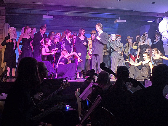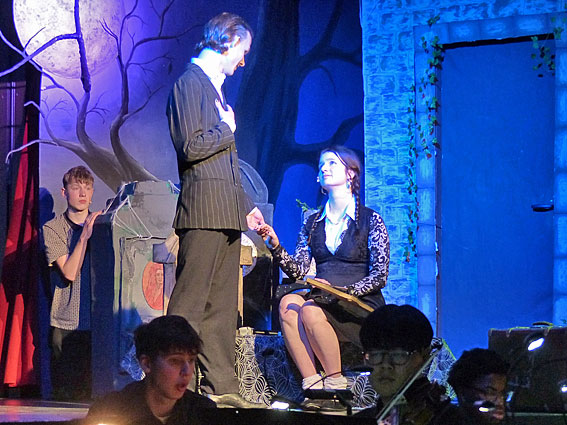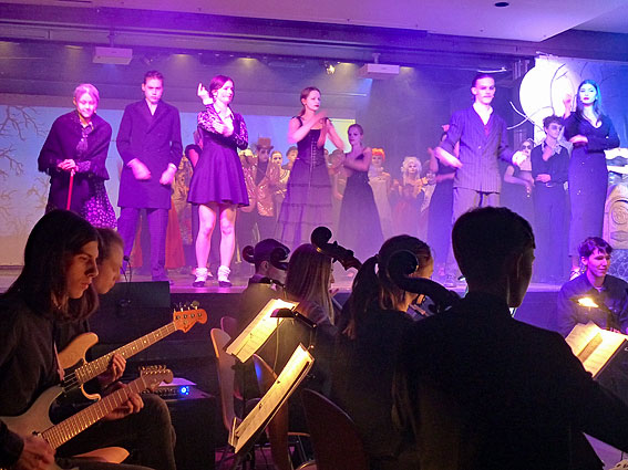 Unterstützt wird die Crew von einem kraftvollen Orchester. Allen voran glänzt Lotta Lovisa Sandkühler an der ersten Geige mit einem bemerkenswert souveränen Spiel. Lehrerin Frauke Schubert gibt für alle den Takt an und beweist bei der Musik, die geprägt ist von jazzigen Einflüssen und ikonischem Fingerschnippen, ein feines Gehör. "Für die Sänger, die hier alle ein extra Vocal-Coaching bekommen, ist es diesmal ebenfalls eine besondere Herausforderung. Es muss schräg klingen, darf aber nicht schief sein", meint Arena. Und auch wenn über zwei Stunden (mit Pause) viel gelacht werde, eine Ulknummer sei die "Addams Family" nicht. Das Thema Anderssein, sich zu respektieren und akzeptieren, wie man ist, steht ebenso im Raum wie die Frage: Was ist normal?