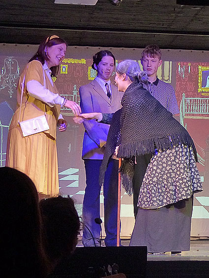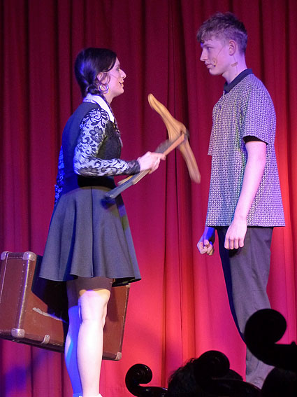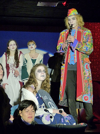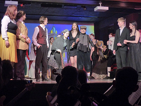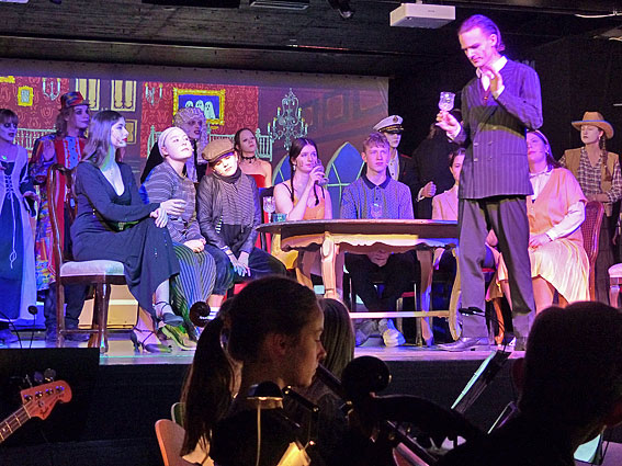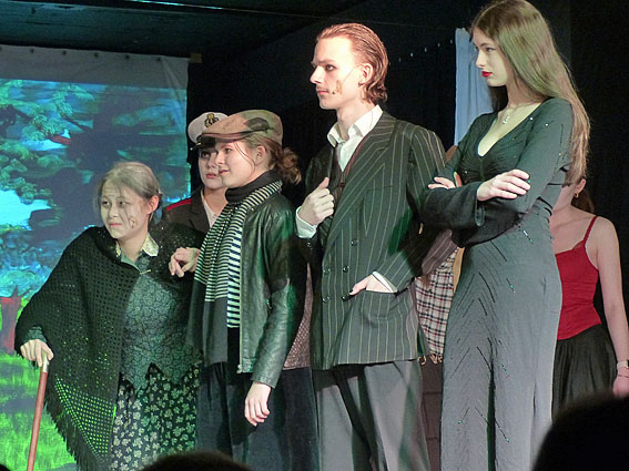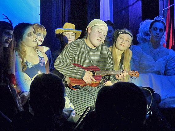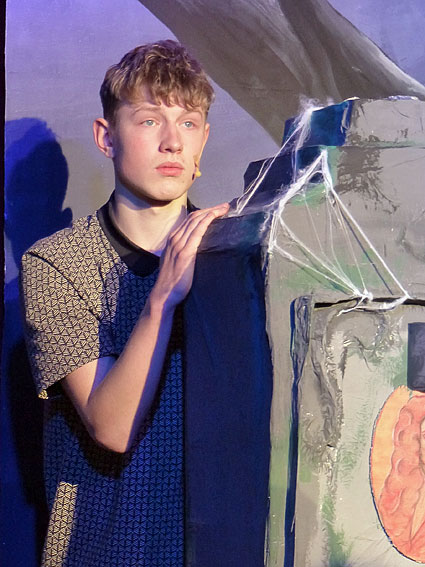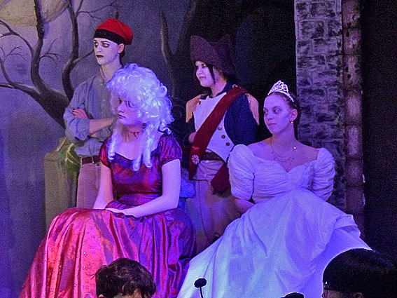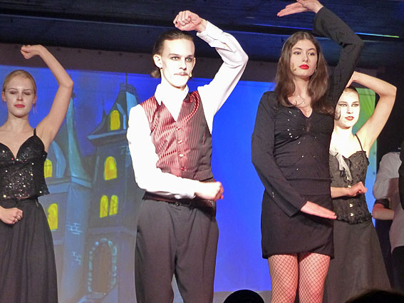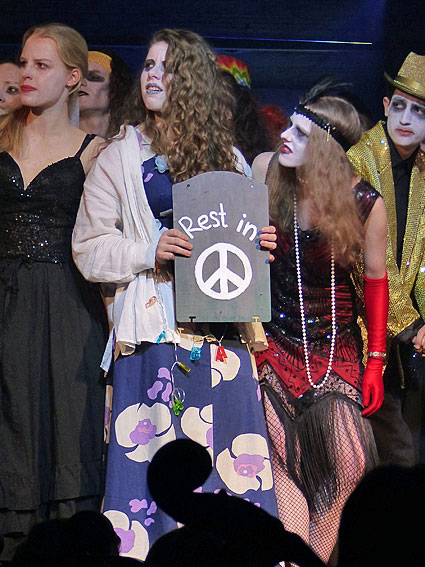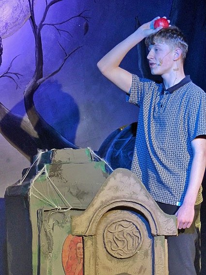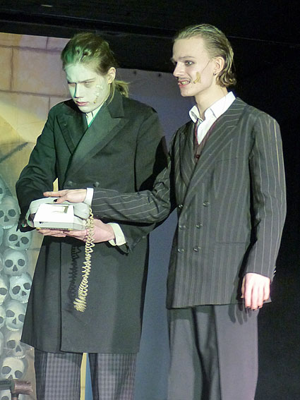 Für eine bemerkenswerte Kulisse des Geschehens sorgen Kunst-Leistungskurse mit einem aufwendigen Bühnenbild, das irgendwo zwischen Gruft und Friedhof einzuordnen ist, sowie etliche Ehemalige. Ob als Beleuchter, in der Technik oder auf der Bühne wie Ex-Schüler Hagen Hegeler, jetzt Physikstudent und zum vierten Mal dabei. Seine Mutter, Sylke Hegeler, kümmert sich wie in den vergangenen Jahren um die Kostüme.“