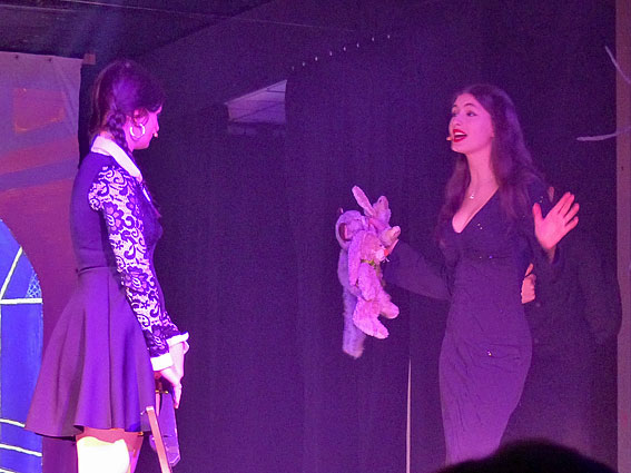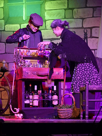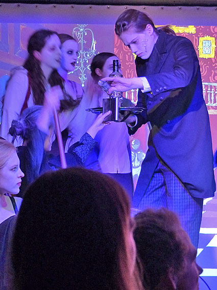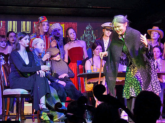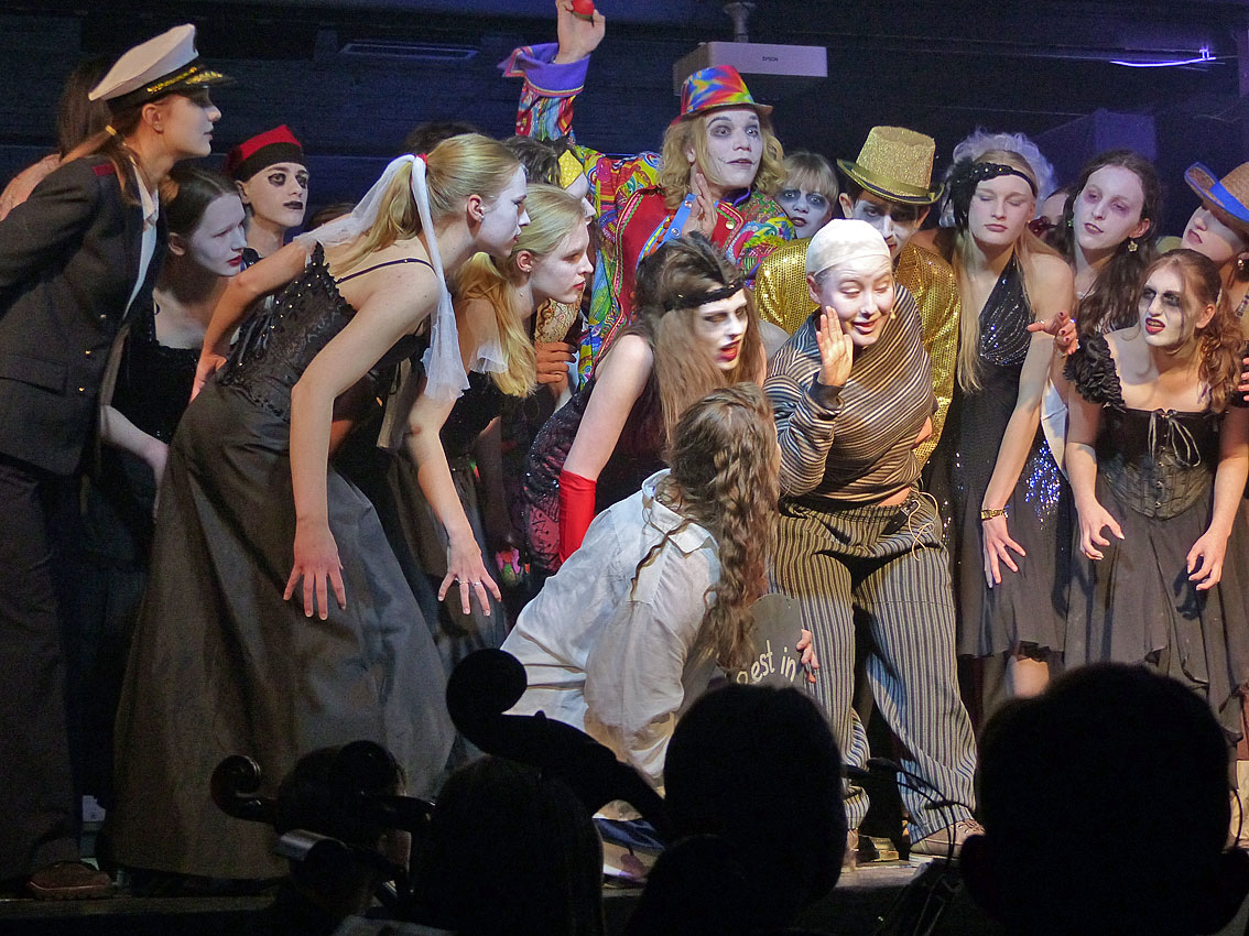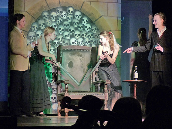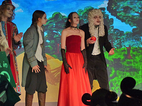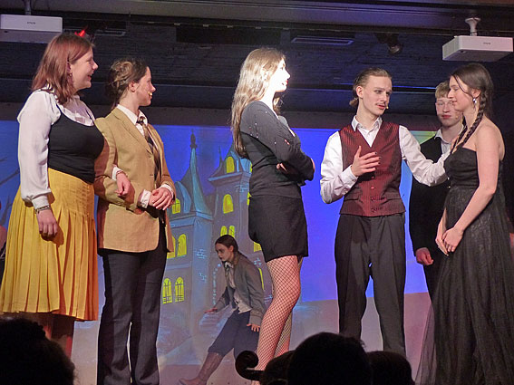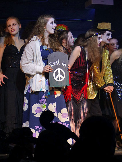 Für eine bemerkenswerte Kulisse des Geschehens sorgen Kunst-Leistungskurse mit einem aufwendigen Bühnenbild, das irgendwo zwischen Gruft und Friedhof einzuordnen ist, sowie etliche Ehemalige. Ob als Beleuchter, in der Technik oder auf der Bühne wie Ex-Schüler Hagen Hegeler, jetzt Physikstudent und zum vierten Mal dabei. Seine Mutter, Sylke Hegeler, kümmert sich wie in den vergangenen Jahren um die Kostüme.“