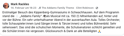 Und von Chicago ist es im Februar 2026 auf die Schulbühne des Kippenberg-Gymnasiums gelangt, wo die insgesamt 8 Aufführungen vom Publikum mit Begeisterungsstürmen und stehenden Ovationen belohnt wurden.