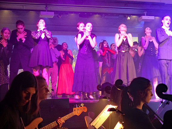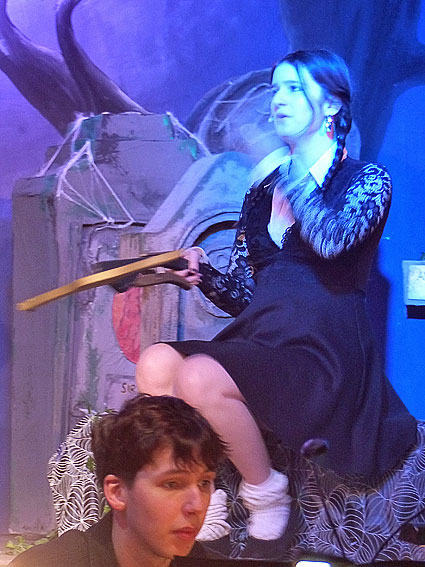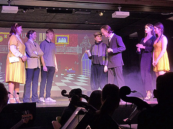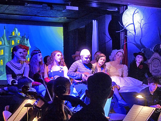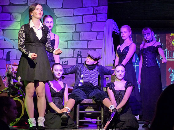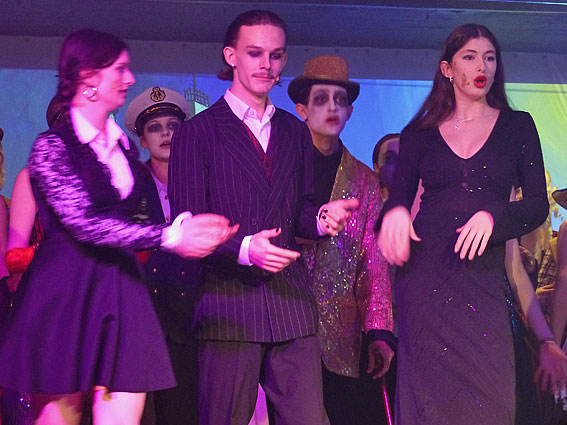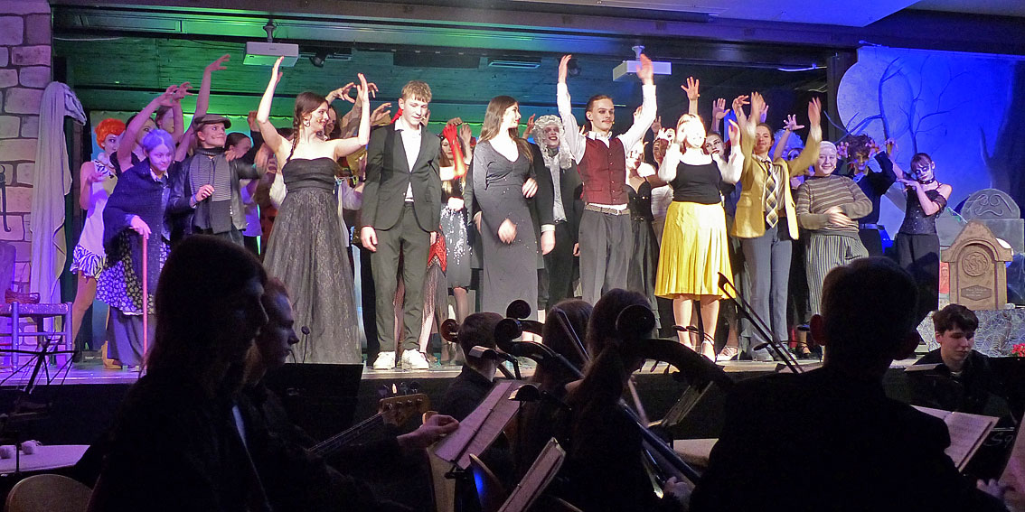 Unterstützt wird die Crew von einem kraftvollen Orchester. Allen voran glänzt Lotta Lovisa Sandkühler an der ersten Geige mit einem bemerkenswert souveränen Spiel. Lehrerin Frauke Schubert gibt für alle den Takt an und beweist bei der Musik, die geprägt ist von jazzigen Einflüssen und ikonischem Fingerschnippen, ein feines Gehör. "Für die Sänger, die hier alle ein extra Vocal-Coaching bekommen, ist es diesmal ebenfalls eine besondere Herausforderung. Es muss schräg klingen, darf aber nicht schief sein", meint Arena. Und auch wenn über zwei Stunden (mit Pause) viel gelacht werde, eine Ulknummer sei die "Addams Family" nicht. Das Thema Anderssein, sich zu respektieren und akzeptieren, wie man ist, steht ebenso im Raum wie die Frage: Was ist normal?