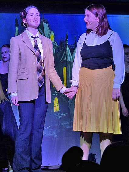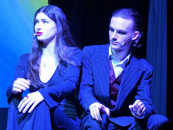 „Artur Saake schmeißt sich als Familienoberhaupt Gomez vor allem gesanglich ins Zeug und schmettert kraftvoll seine Soli in die Aula. Für den 18-Jährigen liegt der Reiz in der Zerrissenheit der Rolle des Grusel-Vaters.Er muss seiner Frau Morticia gerecht werden, die Mafalda Rauhut wunderbar divenhaft gibt, und gleichzeitig Töchterchen Wednesday einen Wunsch erfüllen. Verkörpert von Merle Dannenberg, hat sich diese dummerweise in einen "ganz normalen" Jungen verliebt und will ihn heiraten.